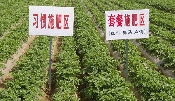 河南鄭州市滎陽高村農(nóng)民黃海望,共種6畝馬鈴薯,其中5畝用的眾德套餐,眾德生物有機肥80公斤,15-10-20高鉀型眾德牌摻混肥100斤在翻地前施用,100斤15-10-20高鉀型眾德牌摻混肥種肥同播,出苗后用態(tài)康科250倍液噴施兩次,另外一畝做對照,同等有機肥,100公斤15-15-15含量的復(fù)合肥作底肥。施用眾德牌摻混肥的馬鈴薯莖葉不旺長,發(fā)根早、根粗、苗壯,中期苗高比對照高15-20厘米,長勢好、病害少,收獲時馬鈴薯個頭大、品質(zhì)好、表面光滑,上市早,賣價高,產(chǎn)量比對照高58-60%,畝產(chǎn)達到6100多斤。